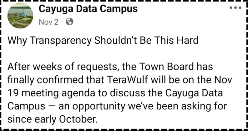 TeraWulf has allegedly been requesting privilege to speak at Town Board meetings for weeks.